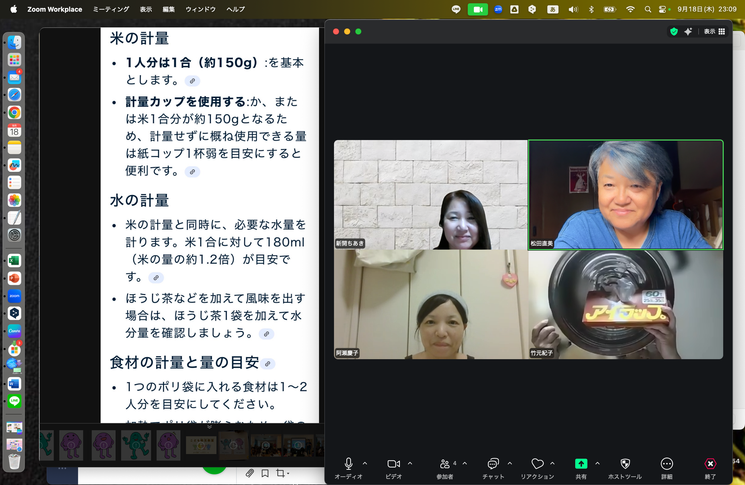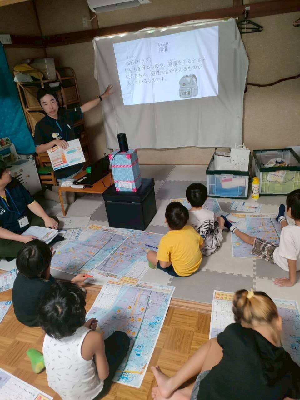 9月は、オンラインで2回のミーティングを行い、これまでの実践を振り返りながら今後の展開に向けた共有を行いました。9月9日は、中間報告会の様子を共有したり、8月に実施した「放課後児童室 つむぎKIDS」「放課後等デイサービス あんしん」での防災教室のふりかえりとアンケート分析を実施しました。「つむぎ」では、子どもたちが体験したアルミシートを数日間遊びの中で使い続けていたことが報告され、体験が日常化していることを確認しました。「あんしん」では、子どもの特性に合わせた工夫が見られ、避難所での過ごし方や持ち物の分担など、新たな気づきが多くありました。壊れたラジオをきっかけに「点検の大切さ」や「生活の中で備えを学ぶ」ことにもつながり、訪問先のスタッフ自身にも避難誘導や、垂直避難の訓練など行動変化が生まれました。防災教室を通じて、大人の意識にも変化が生まれているそうです。