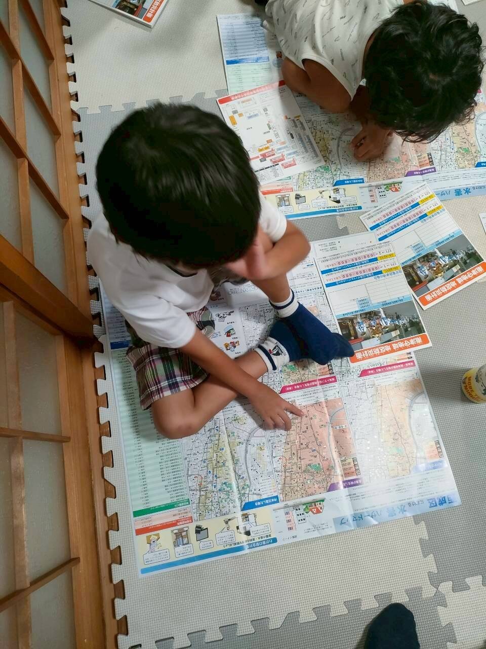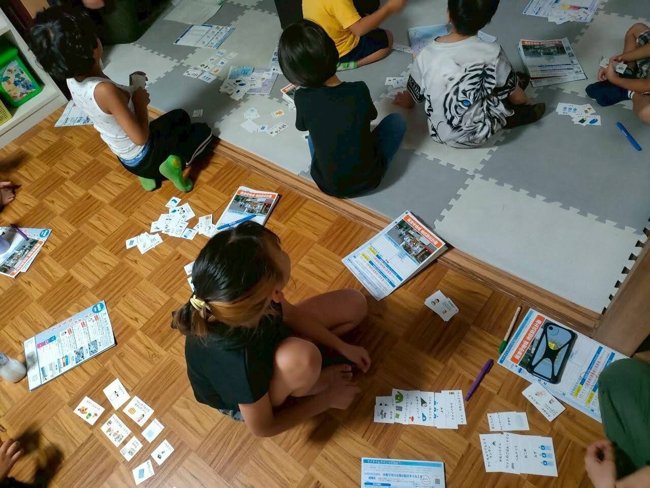 西成区社会福祉協議会の方から2名来ていただき、西成区における水害についてハザードマップを用いて詳しく教えていただきました。小学生10名が参加しました。津波の高さが里の2階に到達する可能性もあることを知り、里やこどもたちが住んでいる近くにある避難場所を、ハザードマップを用いて確認しました。また、「非常用持ち出し袋をつくろう」という活動で、災害時に選んで持っていくものを24種類のアイテムカードの中から8種類を選び、お金や服、ゲームなど人によって必要とするものが全然違うことに発見がありました。実際に選んだ8つを入れたリュック(非常用持ち出し袋)をこどもが背負うと「重い」とつぶやいていました。10月の"ぼうさいタイム"では、ハザードマップを見ながら南津守の地域をまちあるきします。