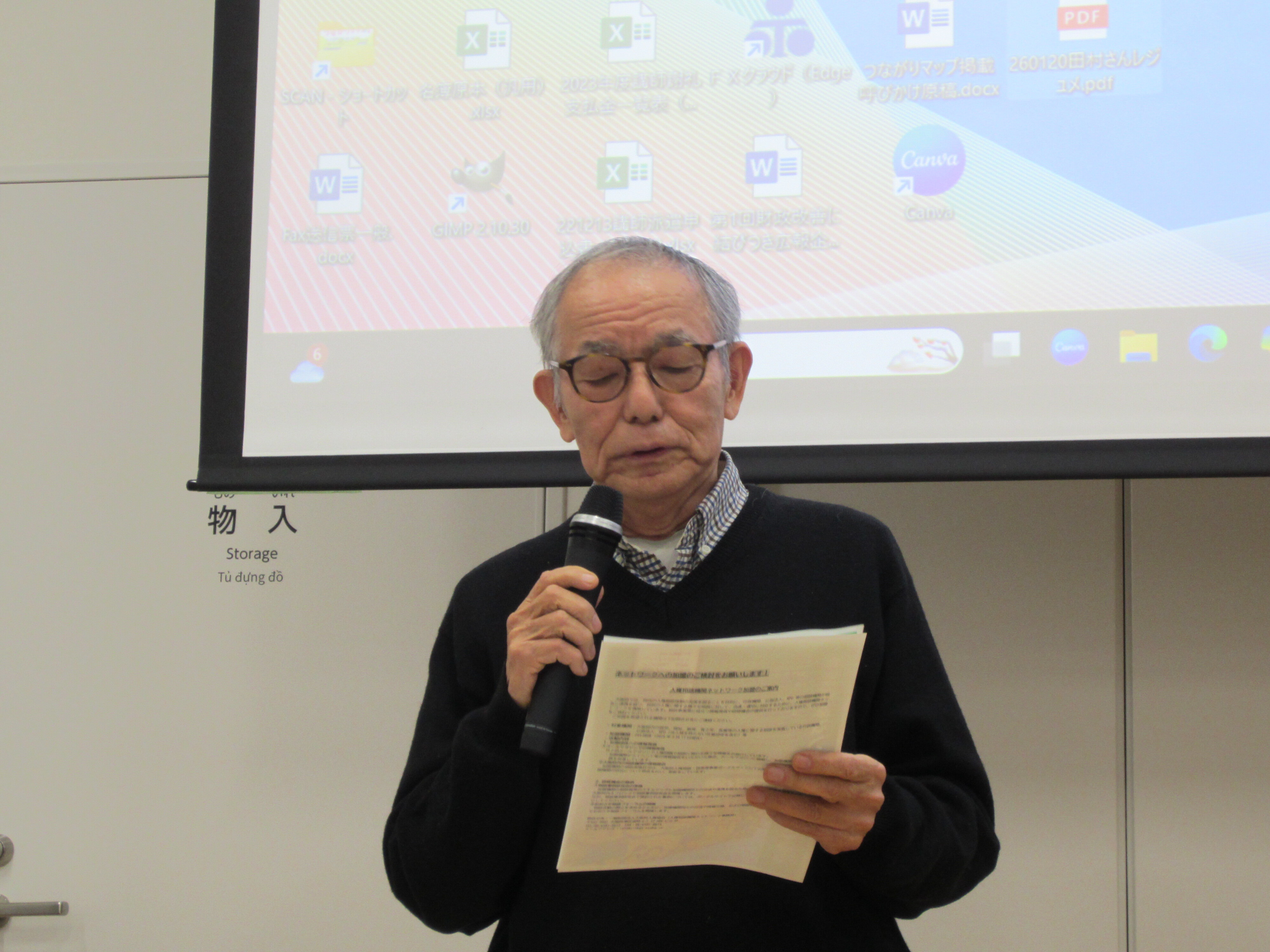 1月20日、富田林市にある一般社団法人富田林市人権協議会において開催し、33人の方に出席いただきました。田村賢一会長(大阪府人権協会代表理事)と、地元から一般社団法人富田林市人権協議会代表理事の坂本信行さんから開会あいさつがありました。
