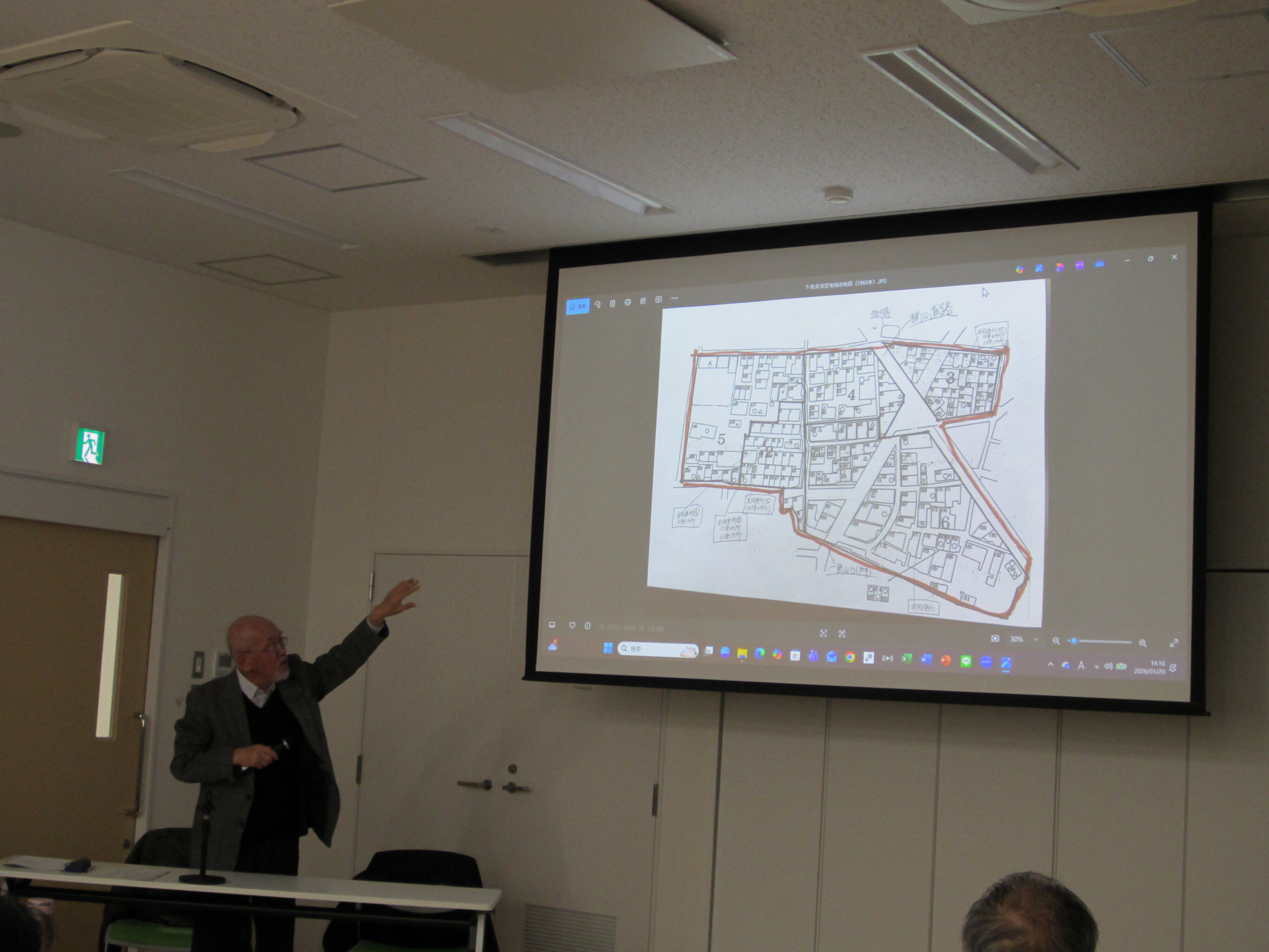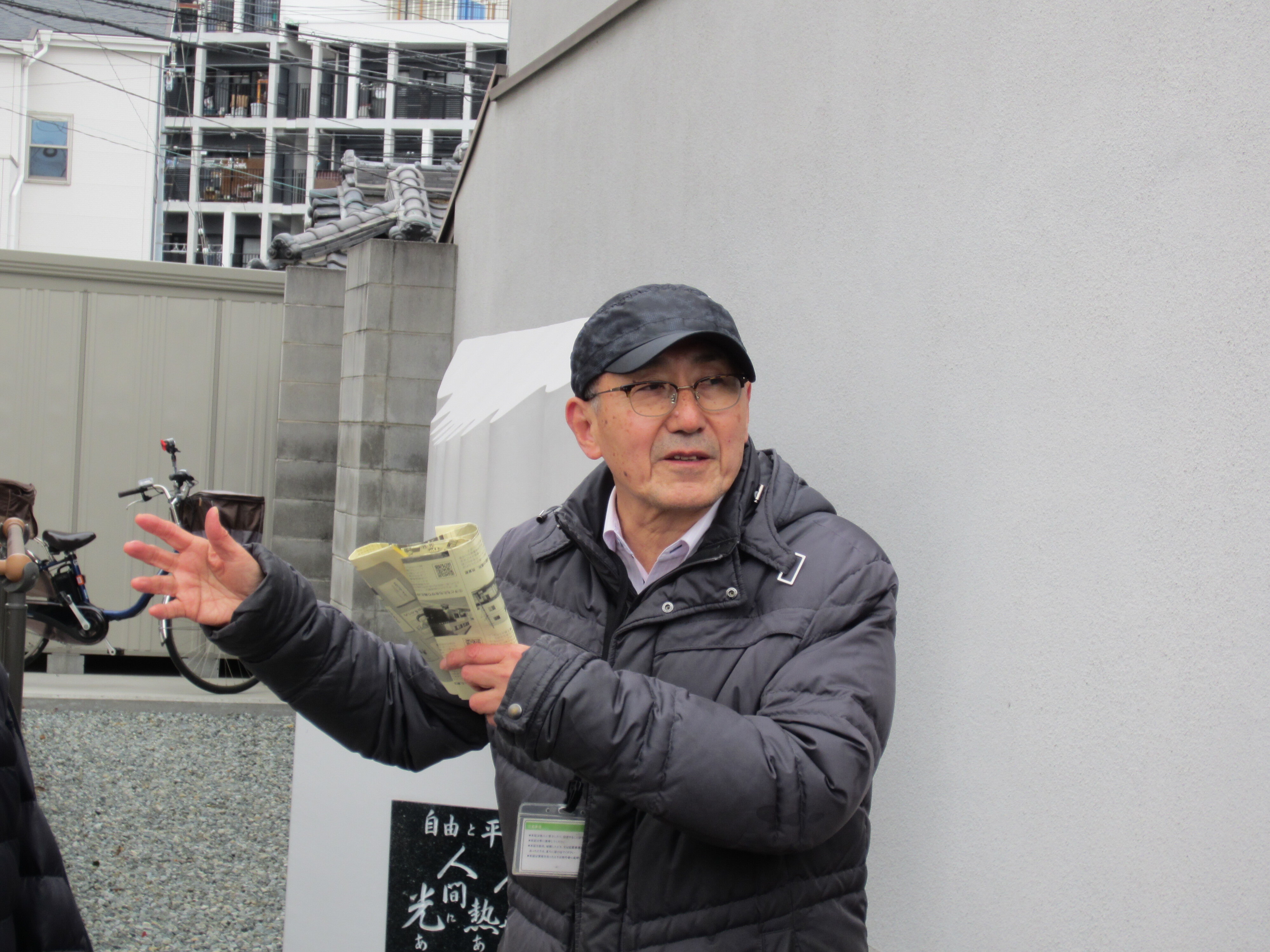 | お話を伺ったあとには実際のまち歩きに出ました。この日は大変寒かったですが、熱い解説をしていただきながら1時間程度まちを歩きました。映像でみる風景とは違い、実際に目でみて触れてみる経験は「百聞は一見に如かず」そのもので、参加者さんのアンケートでもフィールドワークに行ってよかったとの声をたくさんいただきました。 |