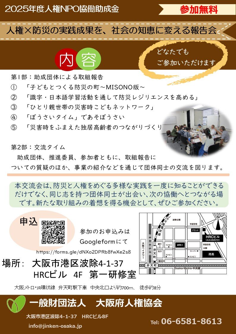 2025年度人権NPO協働助成金 助成団体の取組報告交流会です。 日時:2026年3月26日(木) 14時~17時 場所:HRCビル 4階第一研修室 (大阪市港区波除4-1-37 JR・大阪メトロ 弁天町駅下車) 今年度は「誰もが備えにアクセスできる防災の未来」を重点テーマとし、人権×防災の助成事業を5団体が行いました。 この報告交流会は防災と人権をめぐる多様な実践を一度に知ることができるだけでなく、同じ志を持つ団体同士が出会い、次の協働へとつながる場です。 参加申込:Googleform |